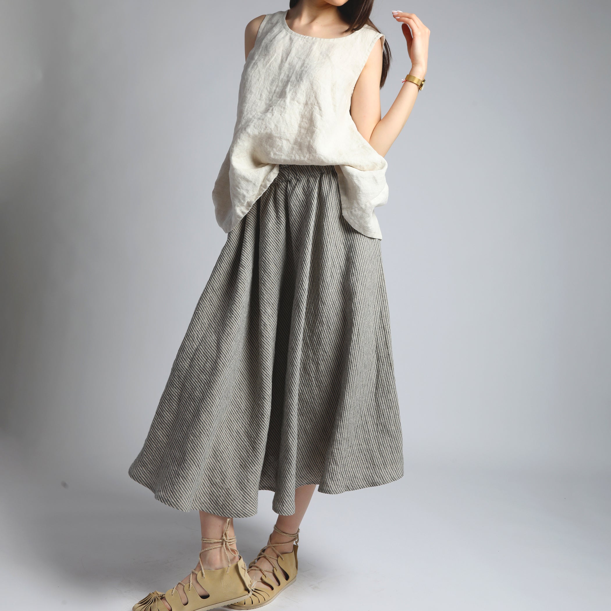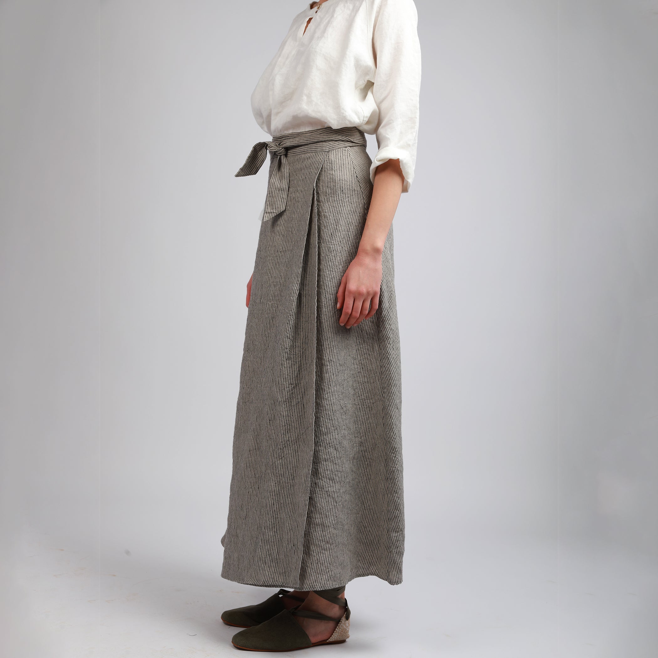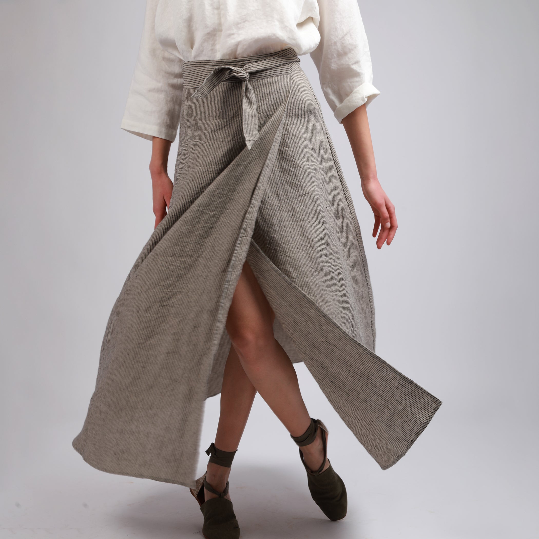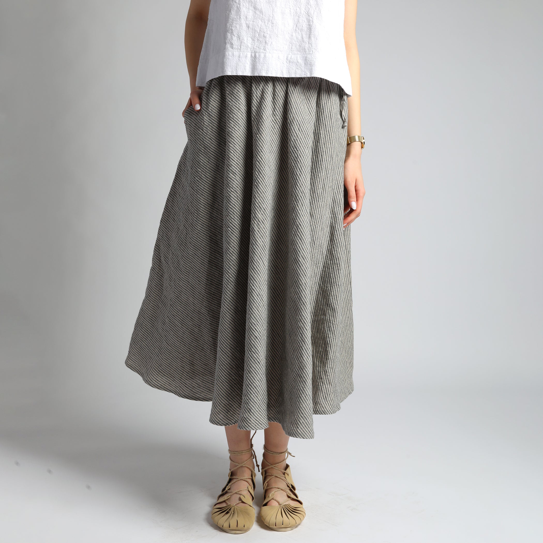 Absolute must have linen skirts in simple lines that drape beautifully in stonewashed softened linen fabric. Subtle flared silhouettes create a soft, relaxed and feminine look that is easily complimented by any top shape, fitted, relaxed or boxy. From knee to maxi length, they are easily dressed up or down and look equally perfect with heels, platforms, flat sandals and trainers.